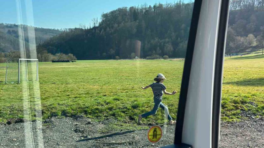 Warum fahren wir trotzdem zu sechst im VW-Bus in den Urlaub? Da gibt es zum Beispiel diesen Moment, wenn wir an einem neuem Ort ankommen und die Schiebetür öffnen: Die Kinder springen aus dem Auto und rennen los, um die Umgebung zu erkunden. Plötzlich „wohnen“ wir neben einem Bolzplatz mit Spielplatz. Der Blick fällt auf eine Wiese, über die gemächlich ein Traktor fährt und mäht. Das Dorf hat nur 200 Einwohner, aber einen Wohnmobilstellplatz. In der Sonne sitzen wir auf einer Bank und vergessen die Zeit, denn es gibt keine langen Wege mehr, um etwas Neues zu sehen.
