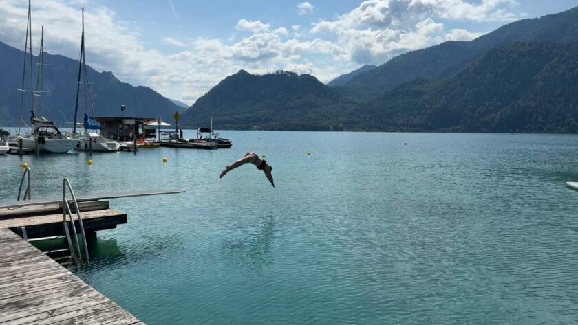 Aber ich wollte ja über Österreich erzählen. Hier entdecken wir doch noch Neuland. Im Salzkammergut ist der Himmel blau mit weißen Postkartenwölkchen und die Seen sind türkis. Wir halten an einem Seebad und verbummeln den Vormittag mit Sprüngen ins Wasser und auf dem Rücken liegend auf der schwimmenden Insel. Das Wasser am Attersee ist so klar, dass man überall den Grund sehen kann. Im Hintergrund ragen die Alpen in den Himmel.