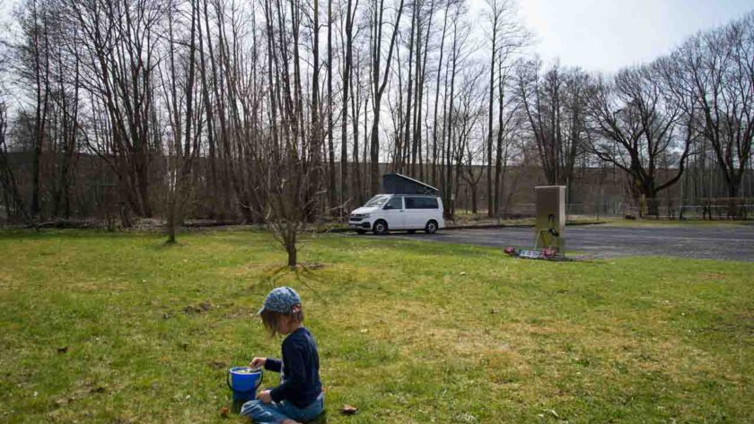 Die Wiese liegt in Marktredwitz nahe der tschechischen Grenze an einem Wohnmobilstellplatz. Erstaunlicherweise ist wenig los, dabei lockt sonst jeder Sonnenstrahl die Wohnmobilisten nach draußen. Ein Bächlein plätschert unter noch kahlen Bäumen, dahinter liegt ein Sportplatz, der jetzt am Gründonnerstag verwaist ist. Wenige Meter weiter wartet der Auenpark mit Spielplatz und Schwimmweiher (zu dieser Jahreszeit noch nicht in Benutzung). Der Stellplatz ist ein Geheimtipp.
