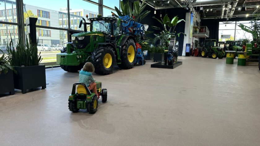 Uns überrascht es, wie selbstverständlich Familien mit Kindern durch die kleine Ausstellungshalle des John-Deere-Forums ziehen. Die meisten der großen Landmaschinen dürfen nicht bespielt werden. Aber im Eingangsbereich gibt es zwei Kabinen, deren Steuerungslemente voll funktionsfähig sind, und wo man sich einmal als Traktorfahrer fühlen kann. Das einzige, was fehlt, ist ein Acker. Das ganze Angebot ist für Besucher kostenlos. Nur einen Haken gibt es: Am Wochenende ist der Showroom geschlossen.